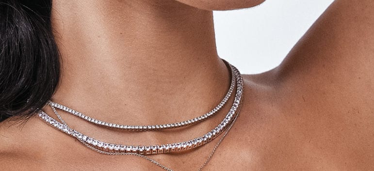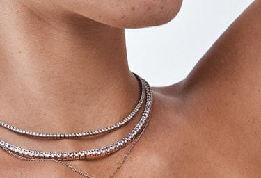 Ideally you'll also want your tennis necklace to sit either just above or just below your collar bone to prevent flipping, so adjusting the length can be one of the easiest solutions.
