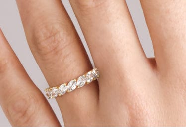 There are two types of eternity rings. These are semi (or half) eternity rings and full eternity rings. The diamonds in semi eternity rings cover only a portion of the band, typically the top half, while full eternity rings have diamonds or gemstones that fully circle the band.