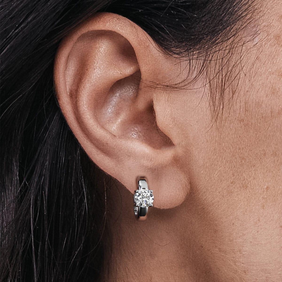 Classic 1 carat total diamond hoop earrings for women, set with high brilliance white and eye clean natural diamonds in solid 14K white gold.