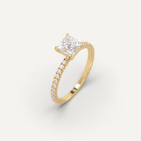 Pave 1 carat princess cut engagement ring, set with a high brilliance white and eye clean natural diamond in solid 14K yellow gold.