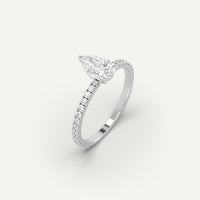 Pave 1 carat pear cut engagement ring, set with a high brilliance white and eye clean natural diamond in solid 14K white gold.