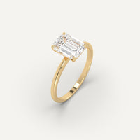 Whisper Thin 2 carat emerald cut diamond engagement ring, set with a high brilliance white and eye clean clarity enhanced natural diamond in solid 14K yellow gold.