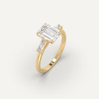 3-Stone 2 carat emerald cut diamond engagement ring, set with a high brilliance white and eye clean clarity enhanced natural diamond in solid 14K yellow gold.
