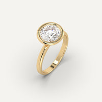 Bezel 2 carat round cut diamond engagement ring, set with a high brilliance white and eye clean clarity enhanced natural diamond in solid 14K yellow gold.