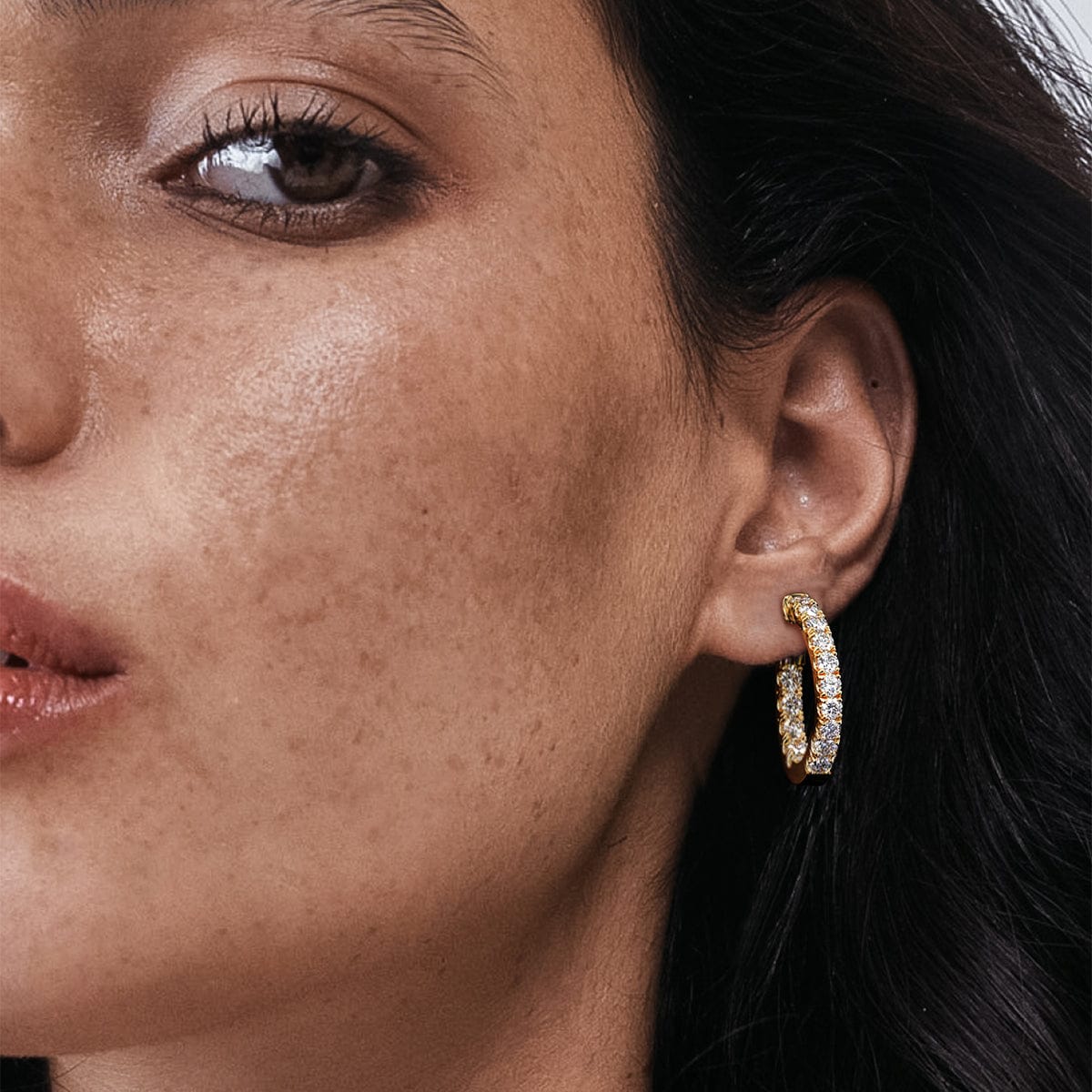Timeless, everyday 3 carat total diamond 26mm hoop earrings for women, set with high brilliance white and eye clean lab diamonds in solid 14K yellow gold.