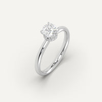 Hidden Halo 1 carat cushion cut diamond engagement ring, set with a high brilliance white and eye clean clarity enhanced natural diamond in solid 14K white gold.