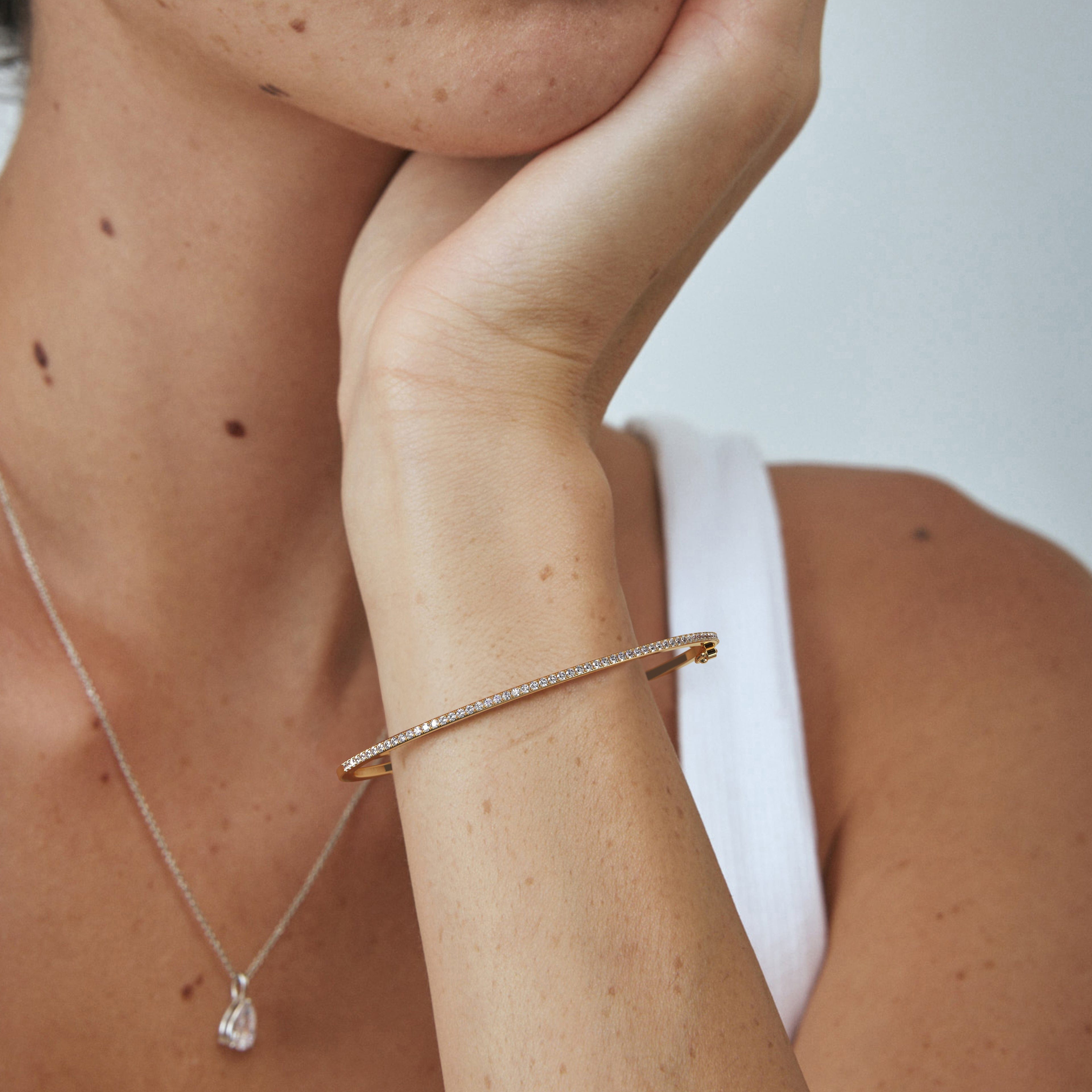 Classic 1/2 carat diamond bangle bracelet for women, set with high brilliance white and eye clean lab diamonds in solid 14K yellow gold.