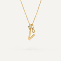 A gold and diamond initial necklace design featuring a letter V pendant charm. This beautiful women's letter necklace is approx. 1cm tall and comes in solid 14k white or yellow gold with an optional 0.05 carat (3mm) diamond and an adjustable 16 inch - 18 inch chain.