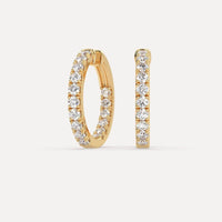 Timeless, everyday 3 carat total diamond 26mm hoop earrings for women, set with high brilliance white and eye clean lab diamonds in solid 14K yellow gold.