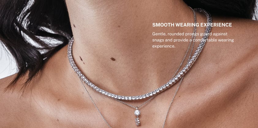 Go bold every day with our 5 carat diamond tennis necklace. The classic 4-prong design comes in a 16.5" (42cm) length, it's perfect for most neck sizes. Diamonds are white, eye clean and high brilliance, 1.9-2.0mm each and come graded F-G/SI1-SI2 for natural diamonds and F-G/VS1-VS2 for lab grown.