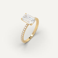 Pave 3 carat emerald cut engagement ring, set with a high brilliance white and eye clean lab diamond in solid 14K yellow gold.