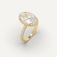 Halo 3 carat oval cut engagement ring, set with a high brilliance white and eye clean lab diamond in solid 14K yellow gold.
