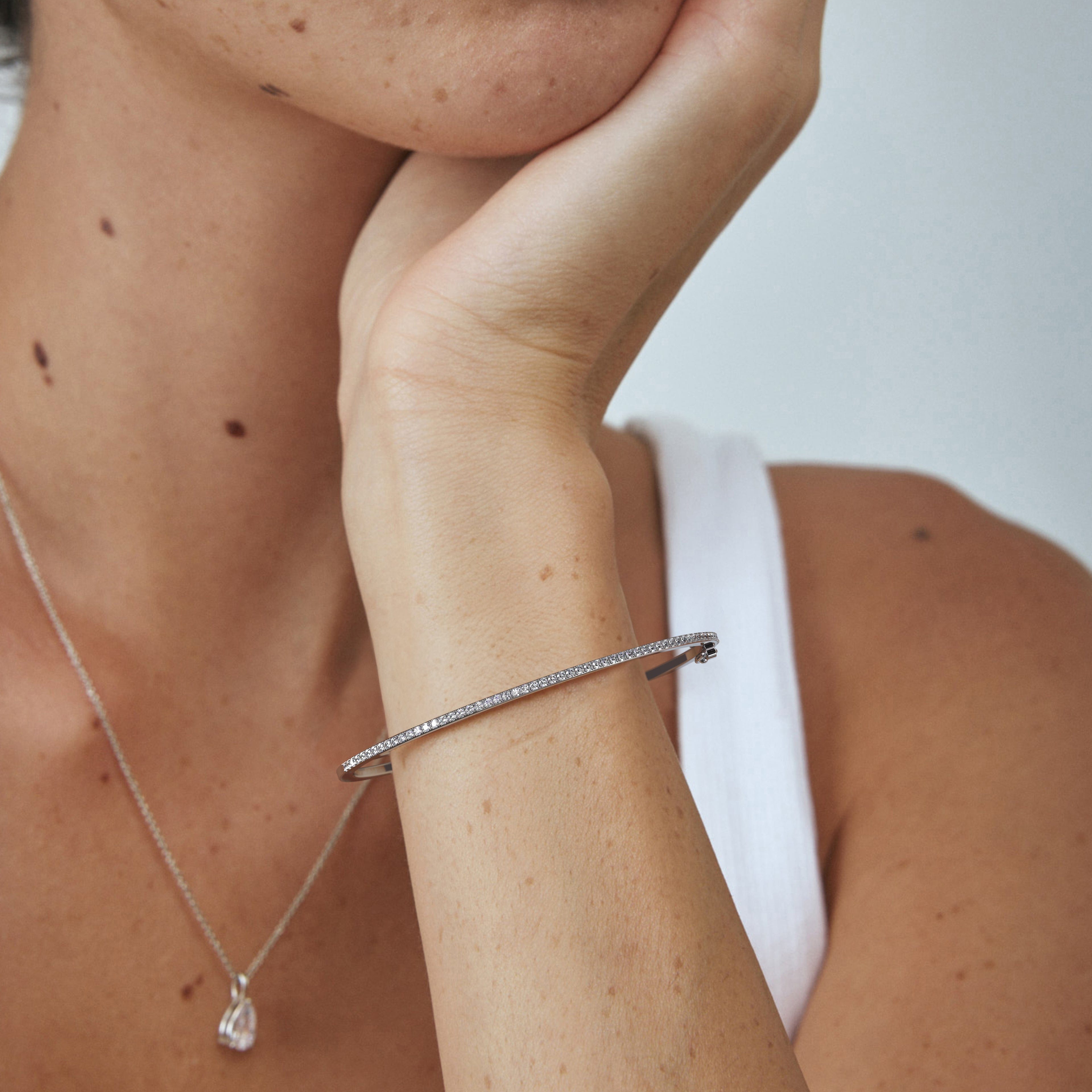 Classic 1/2 carat diamond bangle bracelet for women, set with high brilliance white and eye clean natural diamonds in solid 14K white gold.