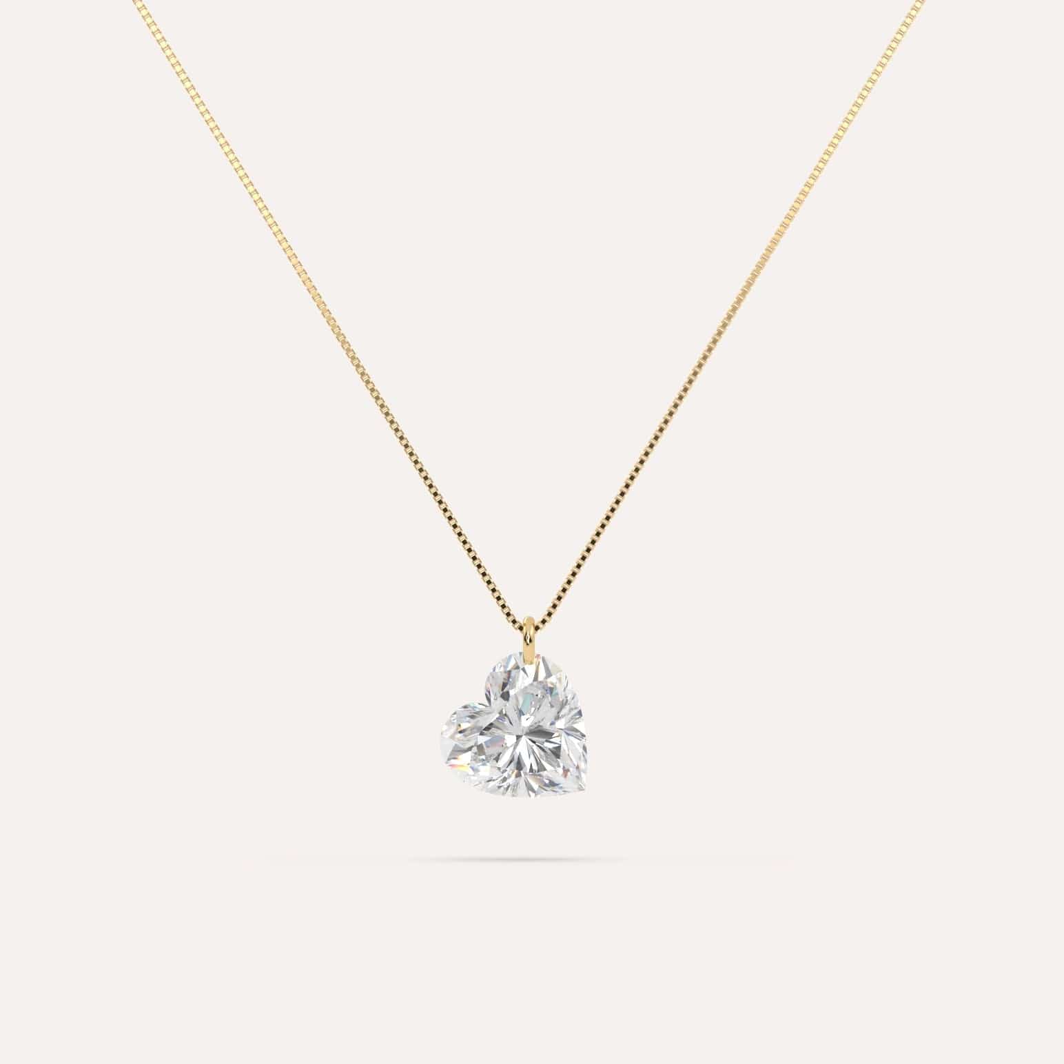 Classic and ultra-minimalist floating diamond necklace with a stunning 2 carat real lab grown heart diamond in 14K yellow gold. The venetian chain necklace is 16 inches and passes through the diamond for a uniquely clean aesthetic. A real floating diamond!