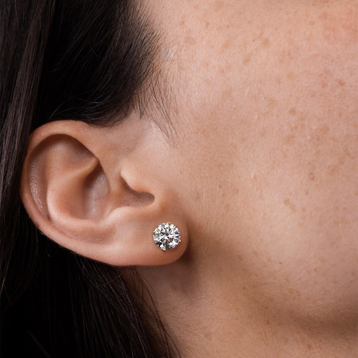 Classic 2 carat single diamond stud earring for women or men, set with a high brilliance white and eye clean natural diamond in solid 14K yellow gold.