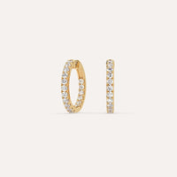 Timeless, everyday 1 carat total diamond 18mm hoop earrings for women, set with high brilliance white and eye clean lab diamonds in solid 14K yellow gold.