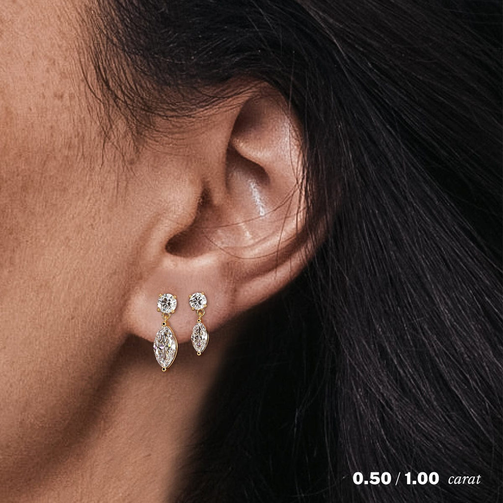 Everyday classic 1 carat total diamond drop earrings for women (approx. 13mm length), set with high brilliance white and eye clean lab diamonds in solid 14K yellow gold.