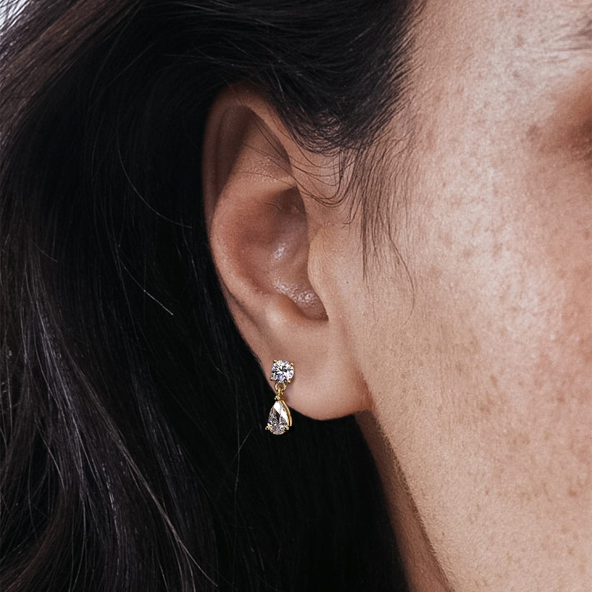 Everyday classic 1 carat total diamond drop earrings for women (approx. 12mm length), set with high brilliance white and eye clean lab diamonds in solid 14K yellow gold.