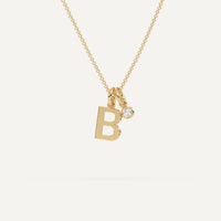 A personalized initial pendant design featuring a gold letter B necklace. This beautiful women's letter necklace is approx. 1cm tall and comes in solid 14k white or yellow gold with an optional 0.05 carat (3mm) diamond and an adjustable 16 inch - 18 inch chain.