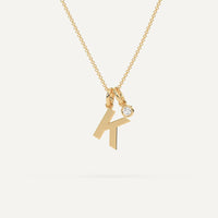 A personalized initial pendant design featuring a letter K necklace. This beautiful women's letter necklace is approx. 1cm tall and comes in solid 14k white or yellow gold with an optional 0.05 carat (3mm) diamond and an adjustable 16 inch - 18 inch chain.