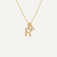A personalized initial necklace design featuring a letter R pendant. This beautiful women's letter necklace is approx. 1cm tall and comes in solid 14k white or yellow gold with an optional 0.05 carat (3mm) diamond and an adjustable 16 inch - 18 inch chain.