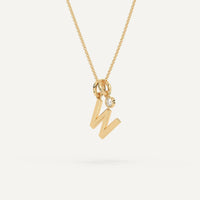 A gold and diamond initial necklace design featuring a letter W pendant charm. This beautiful women's letter necklace is approx. 1cm tall and comes in solid 14k white or yellow gold with an optional 0.05 carat (3mm) diamond and an adjustable 16 inch - 18 inch chain.